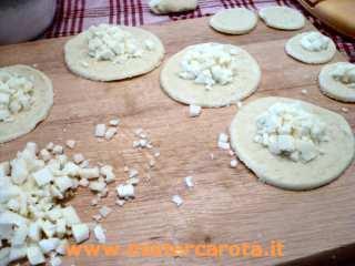 Tritate il pecorino (nel mio caso un semistagionato di Pienza) e mettetene un po' al centro della metà dei dischetti