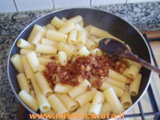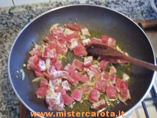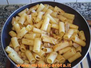 Ingredienti: un trancio di tonno fresco - 2 spicchi d'aglio - 1 piccola cipolla - 1 ciuffo di prezzemolo - 1 filetto d'acciuga sott'olio - mollica di pane (possibilmente del giorno prima) - sale - pepe - vino bianco e rigatoni.