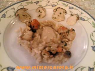 Quando mancano 7-8 minuti alla fine della cottura, aggiungete i porcini e le Capesante, assaggiate di sale e finite di cuocere lasciando il risotto morbido.