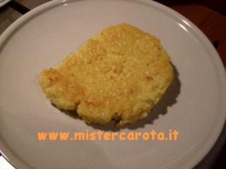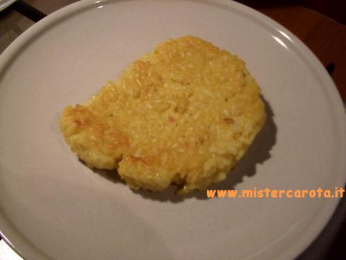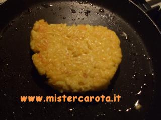 Riscaldate una padela con dell'olio e quando è ben caldo appoggiate la palla di risotto e formate schiacciando delle fittatine.