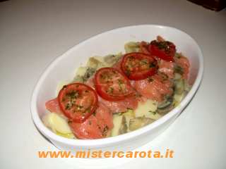 Mondare i carciofi, tagliarli a metà e privarli della barbetta interna, quindi metterli a bagno in acqua e succo di limone. Sbucciare le patate, tagliarle a fette sottili e farle cuocere in acqua salata per 1 minuto, quindi toglierle dall'acqua e disporle sul fondo di una pirofila unta d'olio. Tagliare a fette sottili 1 carciofo e farlo stufare con un po' d'olio e un po' di battuto d'aglio e prezzemolo e distribuirli sulle fette di salmone. Mettere al centro un piccolo spicchio di pomodoro ed arrotolare. Posare gli involtini sulla pirofila con le patate unitamente ai carciofi rimasti, tagliati a spicchi e fatti sbollentare in acqua salata. Adagiare una rondella di pomodoro su ogni rotolino, versavi un po' di battuto d'aglio e prezzemolo diluito nell'olio, salare ed irrorare con un cucchiaio di vino bianco. Distribuire il rimanente olio con il battuto d'aglio e prezzemolo sulle patate e sui carciofi e far cuocere in forno preriscaldato a 180°C. per circa 10 minuti.