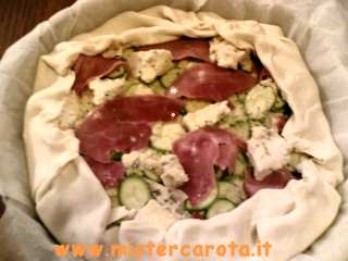 Fate un altro strato con il resto degli ingredienti, rivoltate i bordi e salateli con un pizzichino di sale, quindi mettete la rustica in frigo per una mezz'oretta.