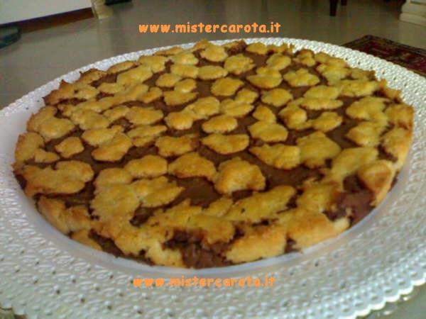 Mettere la Nutella riempiendo gli spazi fra la pasta frolla, quindi finire con l'impasto rimanente aggiungendolo, sempre a pezzettini, come capita.