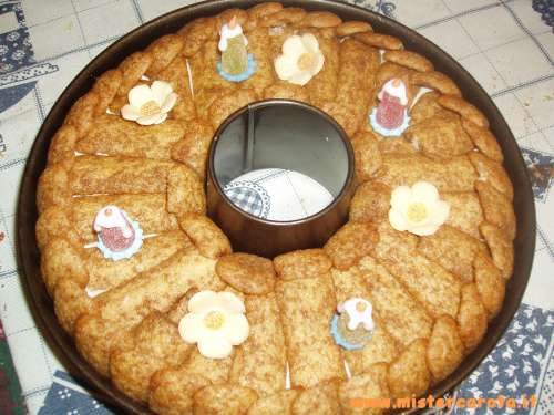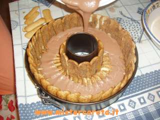 Montare la panna, gli albumi a neve e i 4 tuorli con lo zucchero. Unire il tutto e amalgamare bene. Bagnare i biscotti nel caffè (non zuccherato) e rivestire con questi una teglia per il ciambellone col buco, sia il fondo che il bordo esterno ed interno, come nella foto.