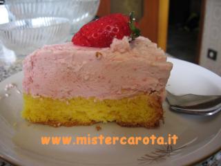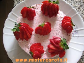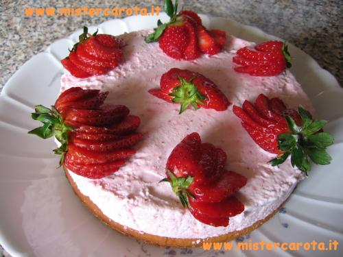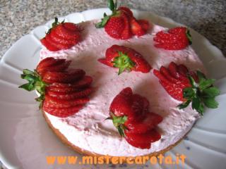 Mettere il disco di pan di spagna in un anello di acciaio o anche in una tortiera a cerniera ovviamente dello stesso diametro della torta, spruzzarlo con la bagna e versare il composto alle fragole.