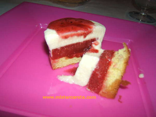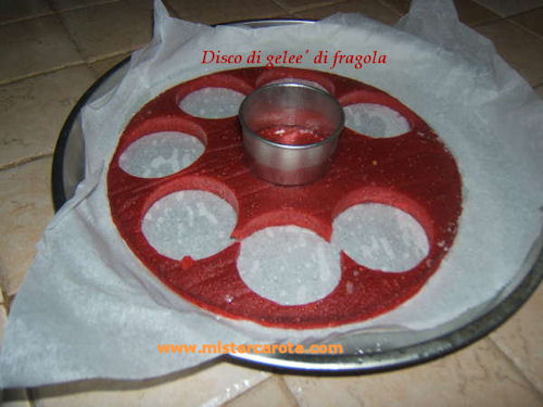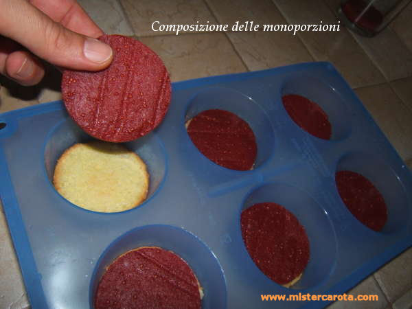 Nel mio caso ho usato lo stampo di silicone per muffin, quindi ho messo sul fondo un minidisco di pan di spagna (se si ha a disposizione un disco grande ritagliare con lo stesso coppapasta che useremo per il geleè i minidischi di pan di spagna), sopra al pan di spagna ho messo un dischetto di geleè di fragola ritagliato dal disco grande che avevo con un coppapasta dello stesso diametro dello stampo muffin, ho versato su ogni monoporzione il semifreddo di limoni e messo in freezer a congelare, così riusciamo a togliere le monoporzioni dallo stampo con estrema facilità.