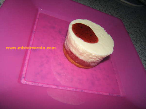 Dieci minuti prima di servire a tavola, sformiamo le monoporzioni, mettiamole al centro di un piatto e coliamo sulla superficie della monoporzione (magari teniamoci non proprio al centro, ma leggeremente spostati su un bordo) una gocciolona di topping ai frutti di bosco.