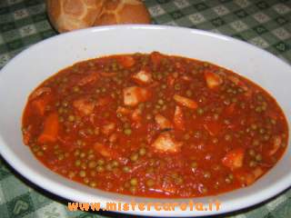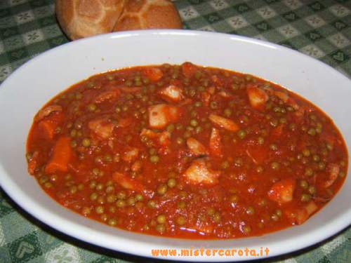 Ingredienti: 3 seppie medie - piselli q.b. - cipolla - 1 carota - 1 costola di sedano - olio extravergine d'oliva - 2 chiodi di garofano - passata di pomodoro q.b. - 1 bicchiere di vino bianco - peperoncino - sale.