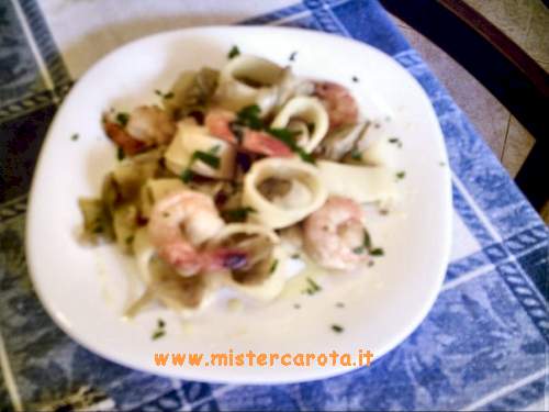 Ingredienti per 4 persone: 350 gr di rondelle di calamari surgelate - 350 gr di code di gamberi surgelati - 250 gr di spicchi di carciofi surgelati - 1/2 bicchiere di vino bianco.