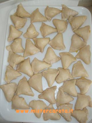 Avvolgete la pasta in pellicola trasparente e riponetela in frigo per 6-7 ore, dopodiché tirate fuori i rotolini tagliateli con un coltello affilatissimo a dischetti tipo girella di liquirizia dello spessore di 1/2 cm prendete quest'ultimi tra le dita indice e pollice unti di strutto e con una leggera pressione al centro comprimetelo tra le dita tirando la pasta all'insù fino a formare delle coppette in cui mettervi il ripieno