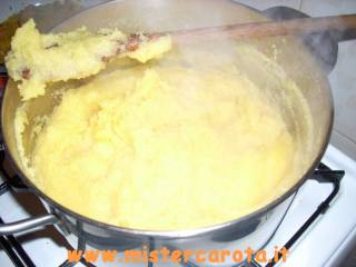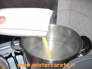 Mettere l'acqua ed il sale in una pentola e farli bollire. Versare la farina per polenta.