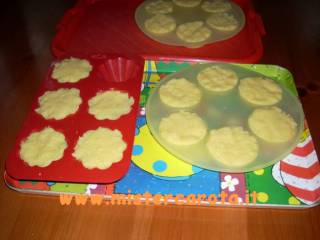 Preparare gli stampi per mettere la polenta. Mettervi dentro la polenta. Potete farla a strati (uno di polenta, uno di sugo, ricoprire con altra polenta) oppure come ho fatto io. La polenta potete prepararla anche il giorno prima e tenerla in frigo.