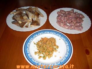 Nel frattempo che la polenta si raffredda prepariamo il sugo. Preparare il trito con le verdure, tagliare a tocchetti la salciccia, pulire ed affettare i funghi.