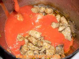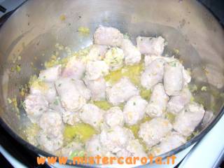 Mettere il trito di verdure a rosolare con un pochino di olio. Aggiungere la salsiccia, e farla rosolare un pochino