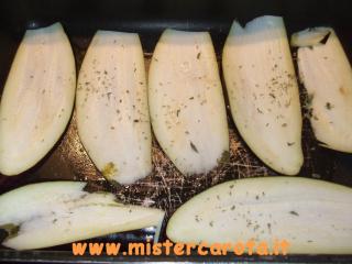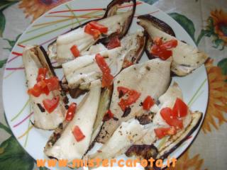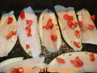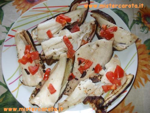 Ingredienti: 1 melanzana grande - 2 sogliole medie - 4 pomodorini - sale - origano - olio.