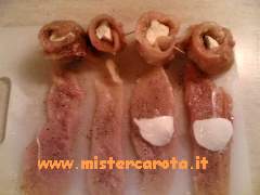 Nel frattempo battete con il batticarne le fettine di pollo, salatele leggermente, spolveratele con i semi di papavero, aggiungete una mozzarellina (in mancanza va bene anche una mozzarella tagliata in tanti pezzi quanti sono le fette di petto di pollo), chiudete le strisce di pollo avvolgendo la mozzarella e fermatele con uno stuzzicadenti.
