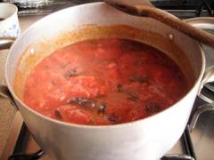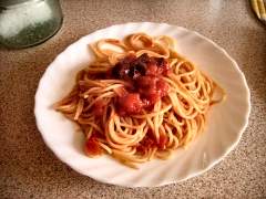 Ingredienti: 400 gr di spaghetti - 2 barattoli di polpa di pomodoro - 100 gr. di olive nere - 1 spicchio d'aglio - 50 gr. di capperi - olio - sale - peperoncino a piacere.