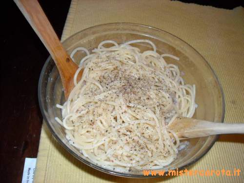 Ingredienti per 4 persone: 500 gr di spaghetti - pecorino romano (a piacere) - pepe nero in grani (a piacere).
