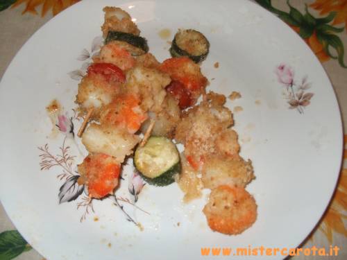 Tagliate le seppie in quattro parti. Impanate le mazzancole e le seppie tagliate e infilzatele formando degli spiedini. Ponete gli spiedini in una pirofila oliata, cospargete di pepe, sale e prezzemolo ed infornate per 15 minuti.