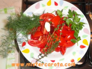 Impiattare aggiungendo crostacei scottati nell'antiaderente e per decorazione prezzemolo finocchietto e timo.