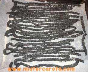 Mentre escono dalla trafila accompagnarli con una mano, tendono ad attaccarsi tra loro, quindi distenderli subito in un vassoio con carta da forno e semola, e muoverli un poco affinché la semola faccia il suo lavoro e li tenga separati. Lasciarli asciugare un poco.