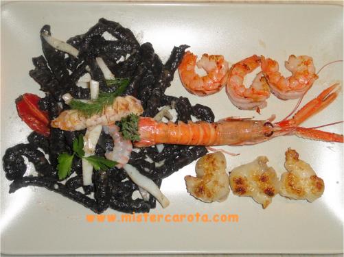 Pulire tutti i crostacei dalle teste e dai carapaci, e mantenere gli scarti, pulire le seppie togliendo entrambe le pelli (quella esterna ma anche quella interna più sottile) mantenendo le sacche del nero da utilizzare con l'impasto.