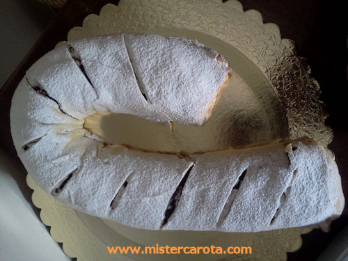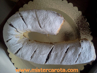 Ho trasferito lo strudel su di una placca da forno, precedentemente unta o con foglio di carta-forno. Ho fatto dei tagli sulla parte superiore.