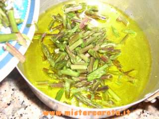 Una ricetta molto semplice ma... buonissima proprio per la sua semplicità. Pulire gli asparagi eliminando la parte del gambo legnosa. Lavarli a tagliarli a pezzettini