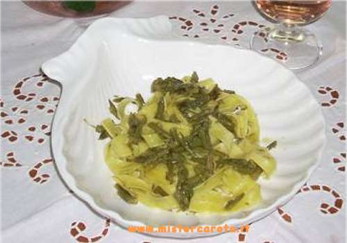 Ingredienti: 1 mazzo di asparagi selvatici - gr 350 di tagliatelle all'uovo ( o il tipo di pasta che preferite ) - 1 spicchio di aglio - gr 100 di olio extra vergine d'oliva - sale q. b.