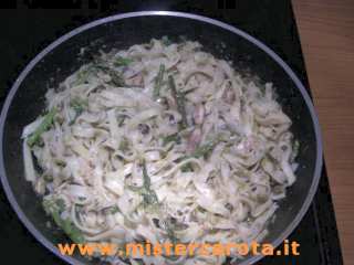 Ingredienti: 300 gr di tagliatelle fatte in casa (non all'uovo) - 1 mazzetto di asparagi selvatici - 1 scatoletta di sardine sott'olio - un piccolo scalogno - sale - pepe.