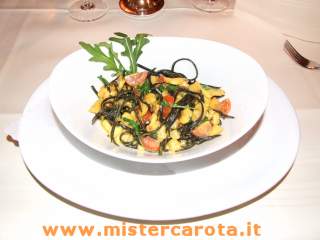 Ingredienti: 400 gr di tagliolini neri (sfoglia all'uovo fresca con l'aggiunta di nero di seppia lavorata benissimo e tagliata a listarelle sottilissime) - olio extravergine d'oliva - scalogno - 400 gr di filetti di pesci nobili a cubetti (orata, spigola, capesante, alcune mazzancolle, qualche arsella) - zafferano - vino bianco secco - fumetto di pesce - prezzemolo - qualche pomodorino pachino - ruchetta - sale