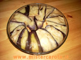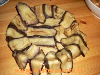 Prendere una pirofila da forno e foderarla con le fette di melanzana.