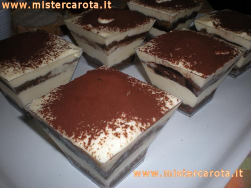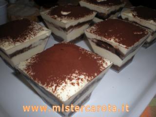 Ho cosparso di cacao, ho messo un altro quadratino leggermente più grande in tutti i bicchierini, ho bagnato anche questi col caffè, poi ho riempito fino all'orlo i bicchierini con la crema al mascarpone.