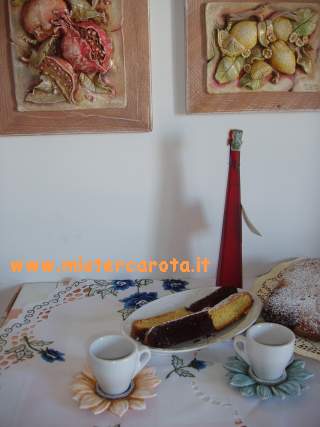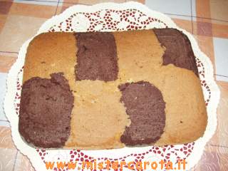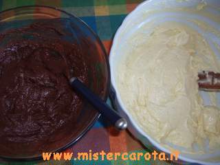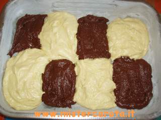 In una teglia da forno rettangolare, imburrata e infarinata, versare il composto di diverso colore a cucchiaiate alternate, come a formare una scacchiera.