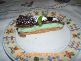 Ingredienti: 300 gr di biscotti secchi - 120 gr di burro - 1/2 lt di panna fresca - 1 bicchiere di sciroppo alla menta - 3 cucchiai di zucchero - 4 cucchiai di fecola - 2 fogli di gelatina - 1 bustina di vanillina - 3 cucchiai di latte intero - crema ganache (50 ml di panna fresca - 150 gr di cioccolato fondente).