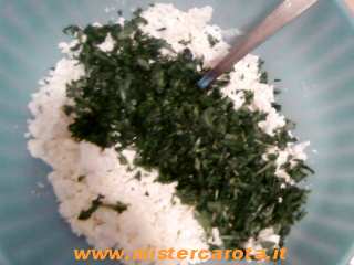 Schiacciare la feta sino a renderla morbida aggiungete la rucola tritata, la ricotta, le uova, il parmigiano ed il latte...