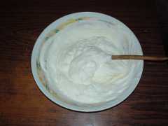 a questo punto versiamo sul mascarpone la panna montata e l'albume montato a neve e, con molta delicatezza, amalgamiamo bene