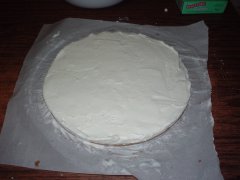 Con una lunga spatola o con un lungo coltello spalmiamo la crema sulla base livellando la superficie e i bordi