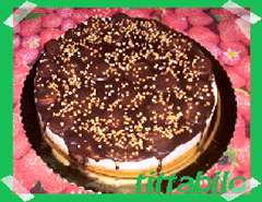 Adesso, con attenzione, togli il cerchio della tortiera dai bordi della torta, sistemi le rondelle di banana sopra, ci versi il cioccolato e fai riposare un paio d'ore in frigo.