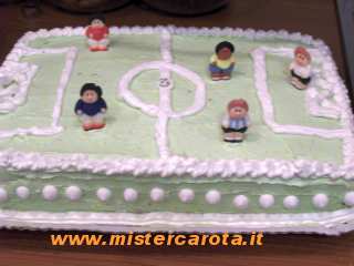 Decorare con panna disegnando le righe del campo di calcio, decorare con meringhe e omini di zucchero.