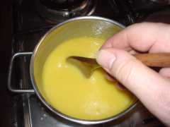Mettiamo sul fuoco basso e mescoliamo continuamente fino a fer addensare bene la crema all'arancia