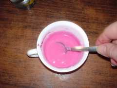 Prepariamo la glassa colorata: mettiamo solo qualche goccia di rosso e appena un goccio di acqua