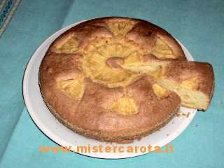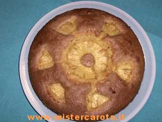Ingredienti: 200 gr di zucchero - 200 gr di farina '00' - 4 uova, a temperatura ambiente - 1 bustina di lievito per dolci - 1 ananas non troppo grande, ben maturo, privato del torsolo e tagliato a spicchi (conservate una fetta intera per la decorazione) - 1 tazzina da caffè di latte - 50 gr di burro fuso - 3 cucchiai di zucchero di canna - 3 o 4 cucchiai di rum.