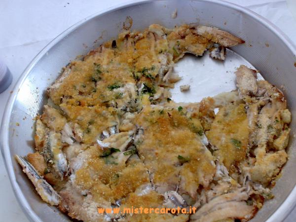 Ingredienti: 300 gr di pangrattato - olio extravergine d'oliva - sale - pepe - prezzemolo - scorza di limone grattugiata - 300 gr di alici.