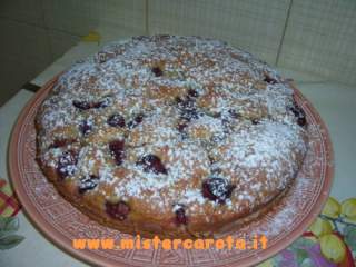 Si aggiungono le ciliegie snocciolate e passate al frullatore e si sbatte ancora, si mette poi la farina ed il lievito e con il cucchiaio di legno si amalgama il tutto, si versa il composto in una teglia imburrata e infarinata e si distribuisco di sopra le ciliegie, si mette in forno a forno caldo a 200°C. per 35-40 minuti.