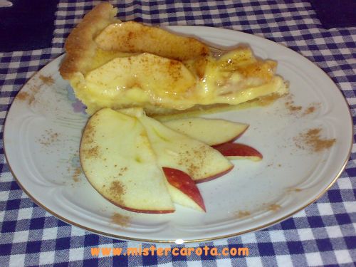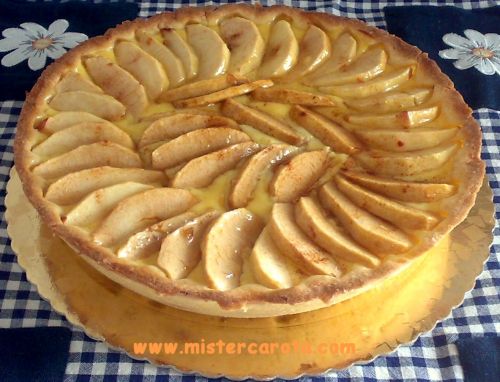 Ricoprite i savoiardi con uno strato di circa 1/2 cm di crema pasticcera, adagiateci sopra a raggiera le mele tagliate a fettine e spolverizzate di zucchero e cannella.