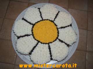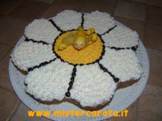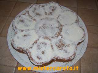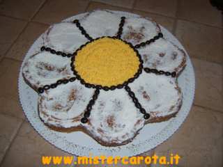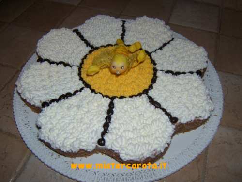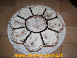 Ingredienti: 130 gr di burro - 130 gr di zucchero - 130 gr di farina - 2 uova - 2 tazzine di caffè - 1 bustina di lievito. Ingredienti per la farcia: 1 vasetto di crema spalmabile al cacao - 2 tazzine di caffè Ingredienti per decorare: panna da montare - chicchi di caffè - colorante alimentare giallo. Occorrente: uno stampo a margherita.