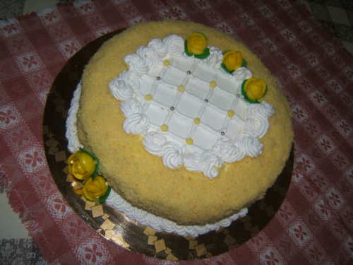 Ho fatto il pan di spagna montando per 20 minuti le uova con lo zucchero, ho poi aggiunto la farina con la vanillina setacciati, ho mescolato con cura dal basso verso l'alto, ho versato nella tortiera e cotto a 180°C. per 30 minuti.