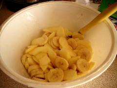 Allora, incominciamo a sbucciare le mele, tagliamole sottili, sbucciamo e tagliamo a rondelle le banane, uniamo il tutto e versiamoci sopra il succo del limone, il bicchierino del liquore e 30 gr. dello zucchero.