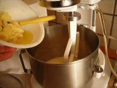Mentre la frutta macera, se abbiamo un'impastatrice ci serviremo di quella, altrimenti tutto a mano o con lo sbattitore elettrico.